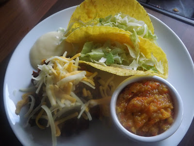 Remove from the oven, plate up 2 taco shells per serving, line the bottom of the shells with shredded lettuce, a quarter of the chili mince. Add 30g of cheese (roughly 2 measured Tbl) to the chili. Serve with 1 Tbl of Salad Cream. Its not sour cream but it goes really well with it.